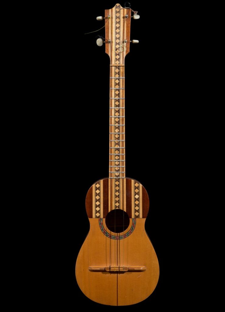 Existen muchas formas tradicionales de adornar una guitarra clásica, siendo la roseta la más impactante. Ejemplares de calidad del cuatro también presentan rosetas, pero la parte superior suele quedar oculta por el golpeador. El cuatro es único porque existen diversas formas de decorar el instrumento, desde patrones repetitivos en el clavijero, el diapasón y el golpeador, hasta la tapa. Estos pueden incluir patrones geométricos en maderas coloridas o mosaicos complejos. Martín Eduardo Gallardo fue un lutier activo durante la primera mitad del siglo XX que influyó en el desarrollo de esta práctica. Se dice que aprendió esta técnica, conocida como taracea, de un viejo constructor de guitarras clásicas español. La taracea es esencialmente una forma de incrustación o marquetería, pero tiene su propia historia y tradición que, como muchas otras cosas (una de mis favoritas es el alfajor), llegó a España desde el este tras la conquista musulmana hace más de mil años.