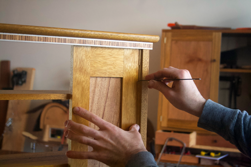 Una vez que las espigas estén cortadas para los travesaños de las puertas, puedes empezar a dimensionar los paneles y hacer pruebas en seco con las puertas. Una vez que estén listas para el pegado, también aplico el acabado, pero solo a los paneles y a las caras frontales y posteriores de los marcos de las puertas. El borde interior recibirá pegamento y un detalle de reborde, y el borde exterior se cepillará para ajustar las puertas en su abertura.