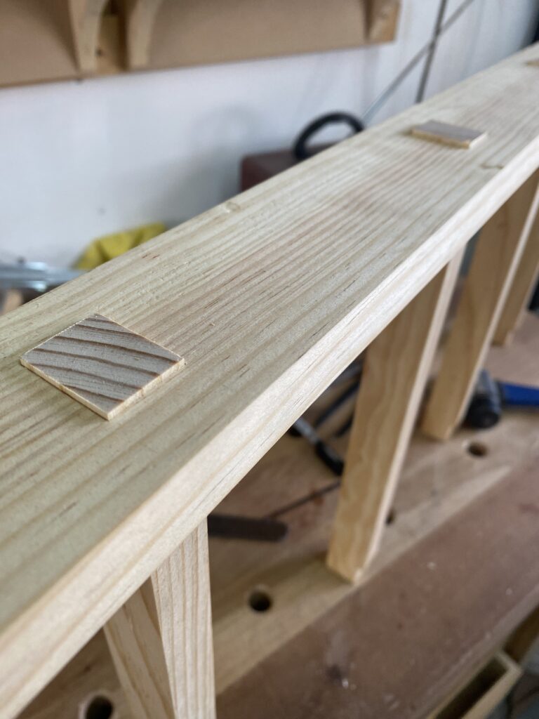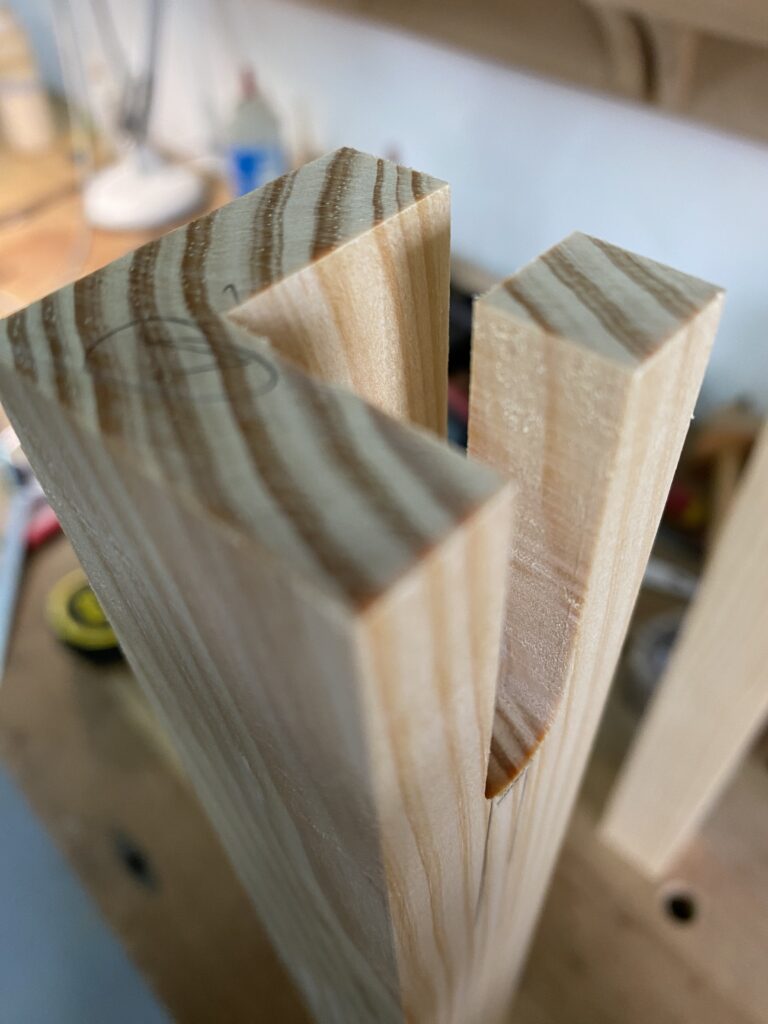 El travesaño inferior, con su espiga pasante, agrega un momento visual que me interesa mucho: la presencia de la espiga es un recordatorio de que la estructura está construida honestamente, sin esconder la forma en que se sostiene. El bisel lo hago antes del encolado, porque permite controlar perfectamente la simetría. Además, trabajar la madera sin restricciones siempre es más seguro que hacerlo con piezas grandes ya ensambladas.