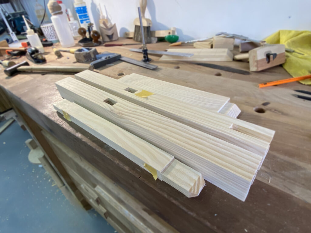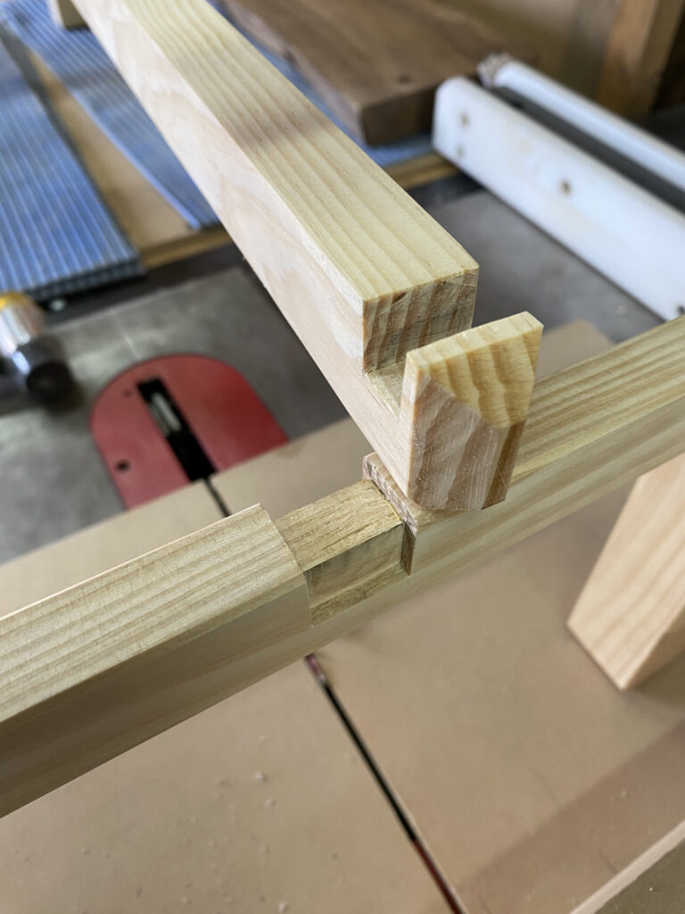 Dejar las espigas largas de los travesaños permiten un ajuste más preciso del encuentro interior. Dejo el largo en exceso para darme libertad a la hora de cepillar.