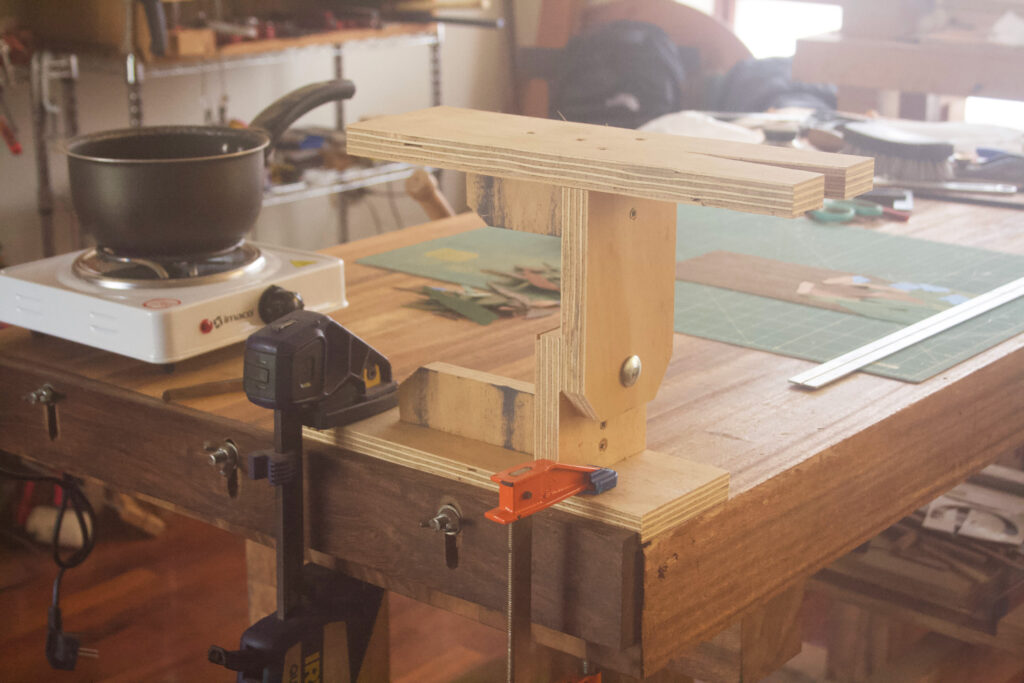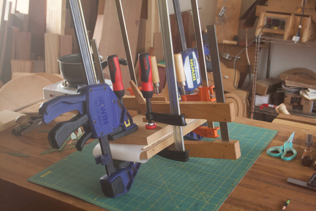 Para comenzar, organiza todos los materiales y ten a mano varios sargentos listos para aplicar a los tacos. Coloca un taco inferior sobre el banco y pon encima una hoja de papel encerado. Aplica cola en la parte posterior del sustrato y pega la chapa de respaldo, presionando para eliminar bolsas de aire y asegurar la adhesión.
