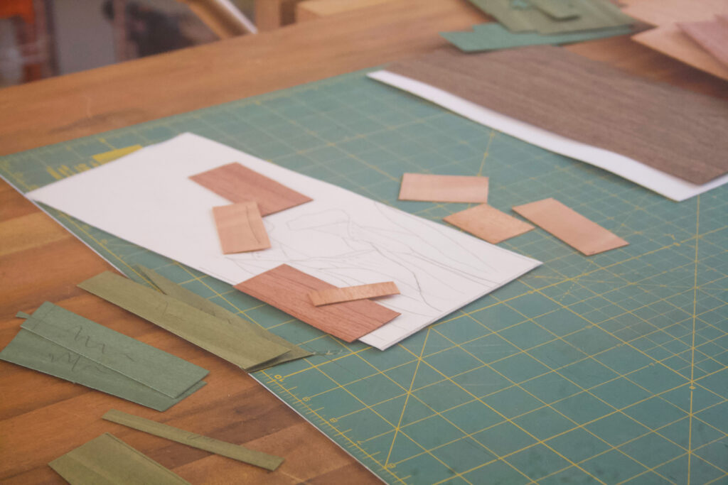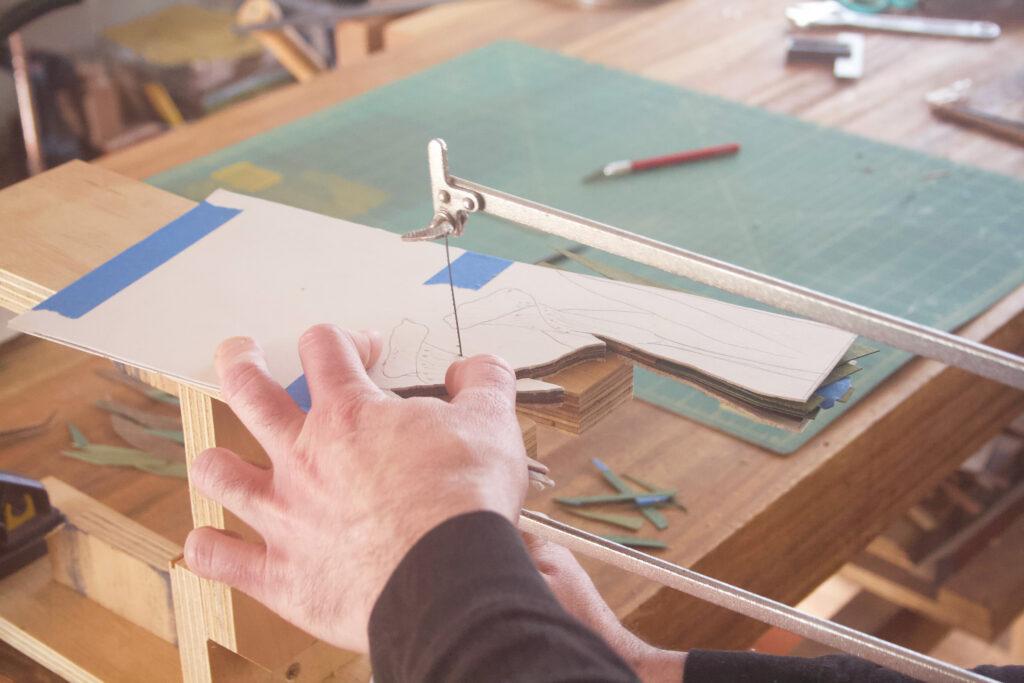 Consejo: prepara una superficie de trabajo limpia junto al banco de marquetería para guardar y ensamblar tus piezas a medida que las cortes. Yo también mantengo una escoba cerca del banco y hago pausas frecuentes para limpiar el suelo debajo del banco de polvo y restos de chapa. Si se te cae una pieza pequeña o se rompe, será mucho más fácil encontrarla en un suelo limpio.