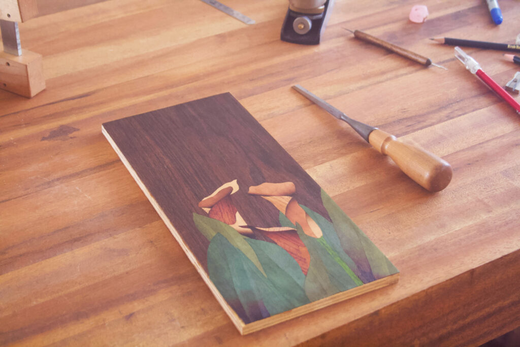Empieza analizando la imagen que has elegido. Observa las diferencias de tonos y colores a lo largo de la misma e imagina qué maderas podrían representarlos mejor. Presta atención también a las sombras y direcciones implícitas en las distintas partes que componen la imagen. Lo primero que deberás elegir es una chapa para el fondo. Puede ser una madera de veta tranquila o un trozo de raíz muy figurado, según el efecto deseado; sin embargo, lo ideal es que contraste y complemente al resto de la imagen. Luego, define las distintas partes de tu composición, por ejemplo, las hojas y pétalos de una flor o los diferentes colores de un ave, y selecciona las chapas que representarán cada una de esas partes. Yo suelo usar chapas teñidas artificialmente, sobre todo para azules y verdes que no se encuentran en la madera de forma natural, pero hay que tener en cuenta que con el tiempo estas chapas teñidas pierden color; por ello, en ocasiones conviene usar únicamente chapas naturales para evitar la pérdida de viveza.