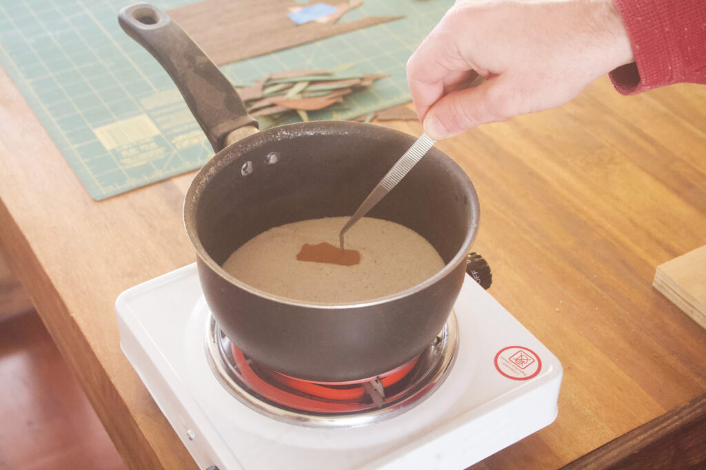 Para darle mayor profundidad y realismo a nuestra marquetería podemos utilizar la técnica del sombreado con arena, en la que se emplea arena caliente para quemar ligeramente la chapa y crear sombras y luces. Para esta técnica necesitarás unas pinzas, una sartén y una hornilla para calentar la arena. Elige los elementos que vas a sombrear y el borde donde se aplicará el efecto deseado. Una vez que la arena esté caliente, sujeta la pieza de chapa con las pinzas y sumérgela en la arena. El borde debe llegar casi al fondo de la sartén. La arena está más caliente cerca del metal, lo que hará que la quema sea mayor en la parte inferior y se produzca un efecto degradado.
