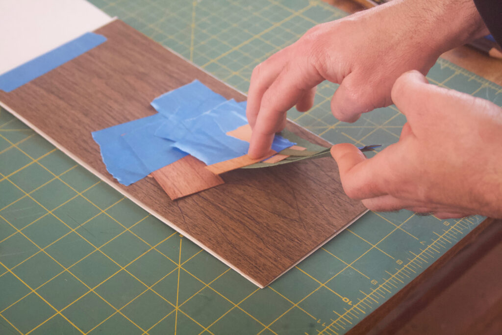 El paquete es un conjunto de chapas que servirá como fuente de cada una de las piezas individuales utilizadas para componer la imagen elegida para tu proyecto. Mencioné previamente el método de ventana, que utiliza un cuchillo para extraer una parte de una chapa y encajarla en el fondo. La ventaja de este método es que puedes ver a través del fondo y orientar la veta de la pieza exactamente como deseas. También genera mucho menos desperdicio. Sin embargo, puede resultar algo tedioso y lento.