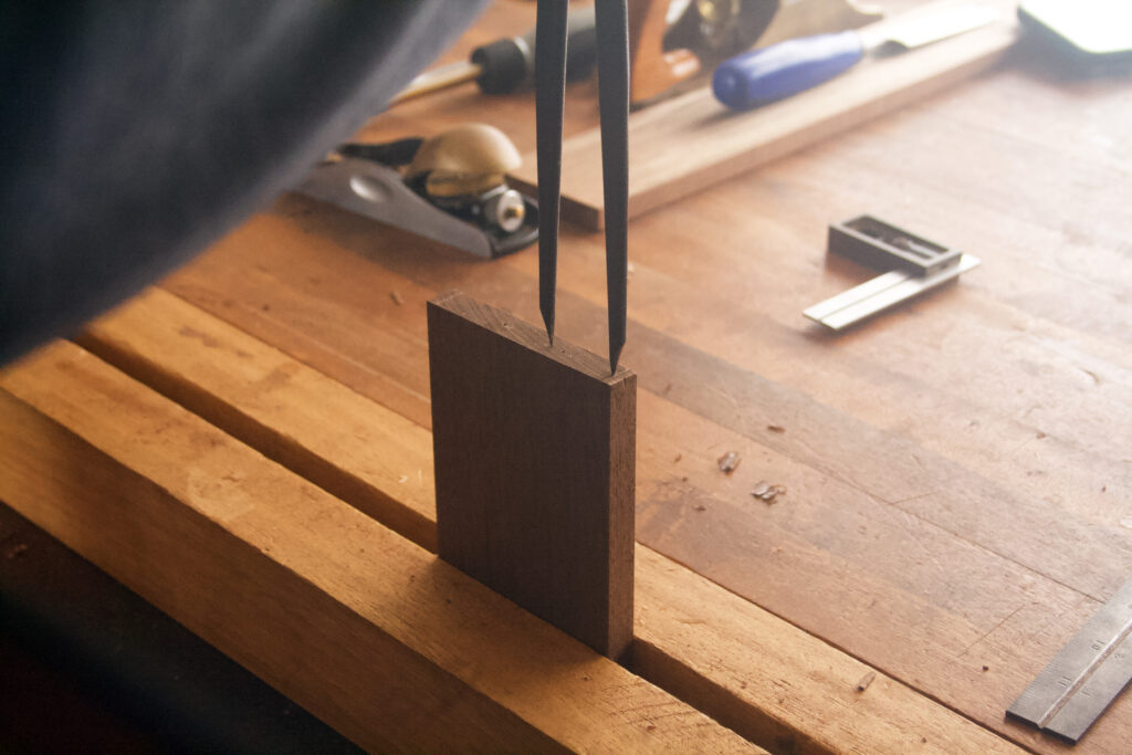 Independientemente de las decisiones ornamentales que tomes, este proyecto comenzará con las patas. Elegà nogal (Juglans spp.), de la variedad peruana, para la base. Es bastante uniforme en su color oscuro y no tiene una veta muy pronunciada, pero si estás usando una madera con una diferencia notable entre las caras radial y tangencial, es recomendable buscar lo que se llama grano bastardo o oblicuo. Dado que esta mesa tiene un diseño delicado, se beneficia enormemente de un sentido de equilibrio y uniformidad entre las pocas partes que la componen.