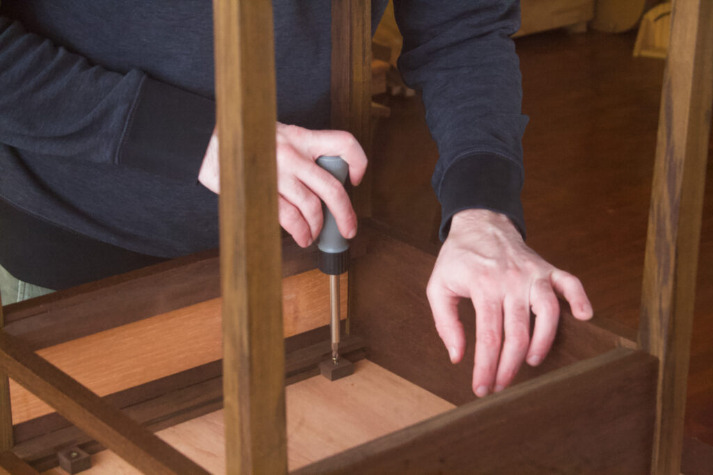 Antes de comenzar con el cajón, vamos a fijar el tablero a la base, ya que esto puede afectar cómo encaja el cajón. En el banco, coloca una manta de mudanza o algo para proteger el trabajo. Dale la vuelta al tablero y luego voltea la base y colócala encima. Asegúrate de que todo esté centrado y las esquinas del bisel se alineen con las esquinas de las patas de la mesa. Coloca los botones a 3-4 cm del riel delantero y del travesaño trasero, y marca a través de los agujeros previamente perforados con un punzón. Taladra un agujero piloto e instala los botones.