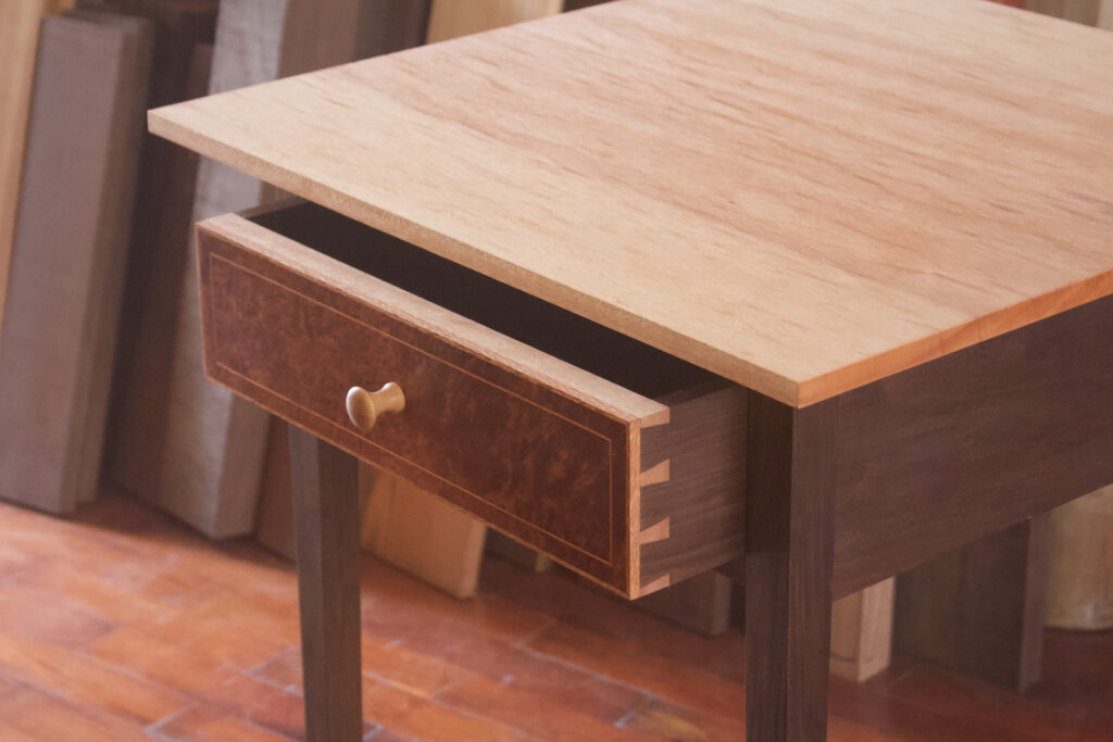 Puedes darle un toque de elegancia haciendo un ensamble de cola de milano en el cajón, como lo hago en este ejemplo, o mantenerlo simple con un ensamble de rebajes y tarugos. En algunos ejemplos de esta mesa, la única ornamentación es el bisel en la parte inferior del tablero. Debido al diseño fuerte pero delicado, se verá bien de cualquier manera que decidas llevarlo a cabo.