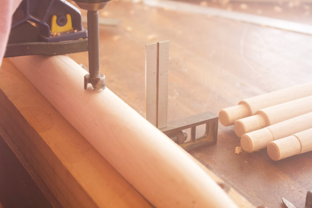 Con todas las piezas torneadas, puedes comenzar el marcado y perforación. Aquí es donde entran en juego conceptos más profundos. Dado que estas espigas son redondas, serán inherentemente más débiles que las cuadradas, porque dentro de un agujero circular, gran parte de la superficie de pegado será de testa. Otro aspecto a considerar es el movimiento de la madera.