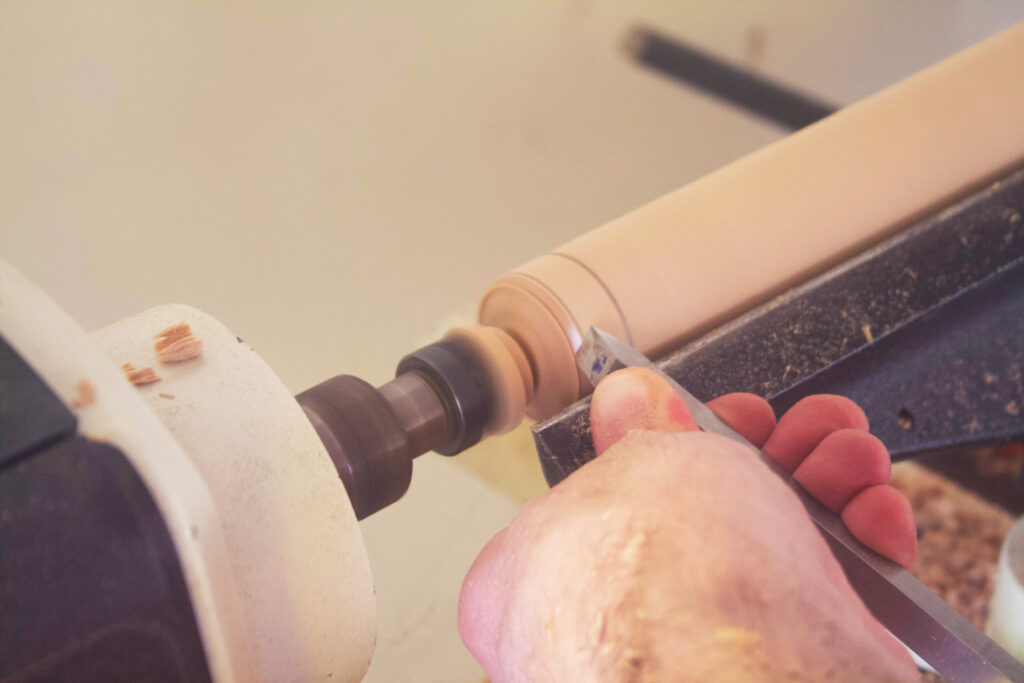 Una vez seleccionada la madera, corta las piezas a la longitud deseada y luego pásalas por la sierra cinta para uniformar el grosor. Todas las piezas se tornearán en el torno utilizando solo 2 o 3 herramientas.