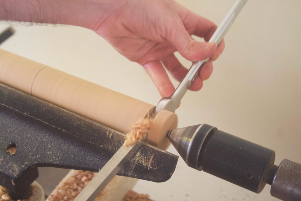 Marca la longitud con lápiz (37.5 cm) y usa una herramienta de parting o de perfilado para crear un escalón de 1.9 cm justo debajo del pie de la pata.