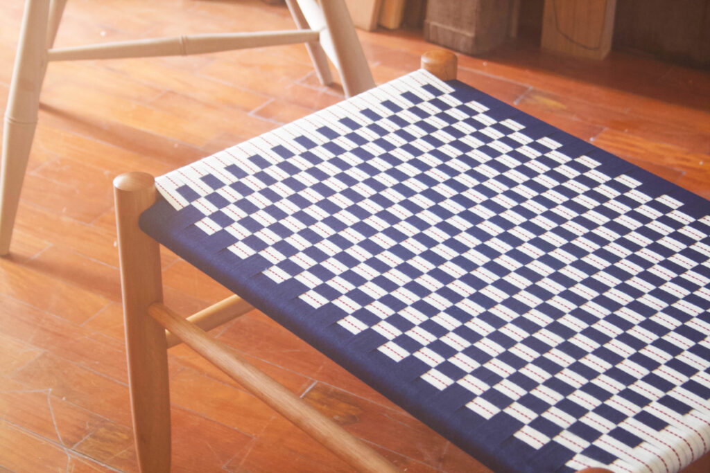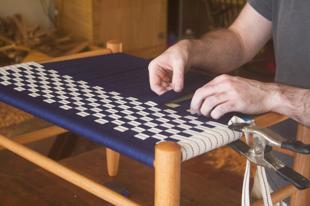 Para tejer el tramado, selecciona una esquina y engrampa la cinta al lado posterior del travesaño. Lleva la cinta alrededor y sobre la parte superior, y comienza a tejer, pasando por encima de una fila del urdido y debajo de la siguiente, alternando hasta llegar al final de la fila. Ahora voltea el taburete, lleva la cinta alrededor del travesaño hasta la parte inferior y teje la misma fila en la parte inferior del taburete.